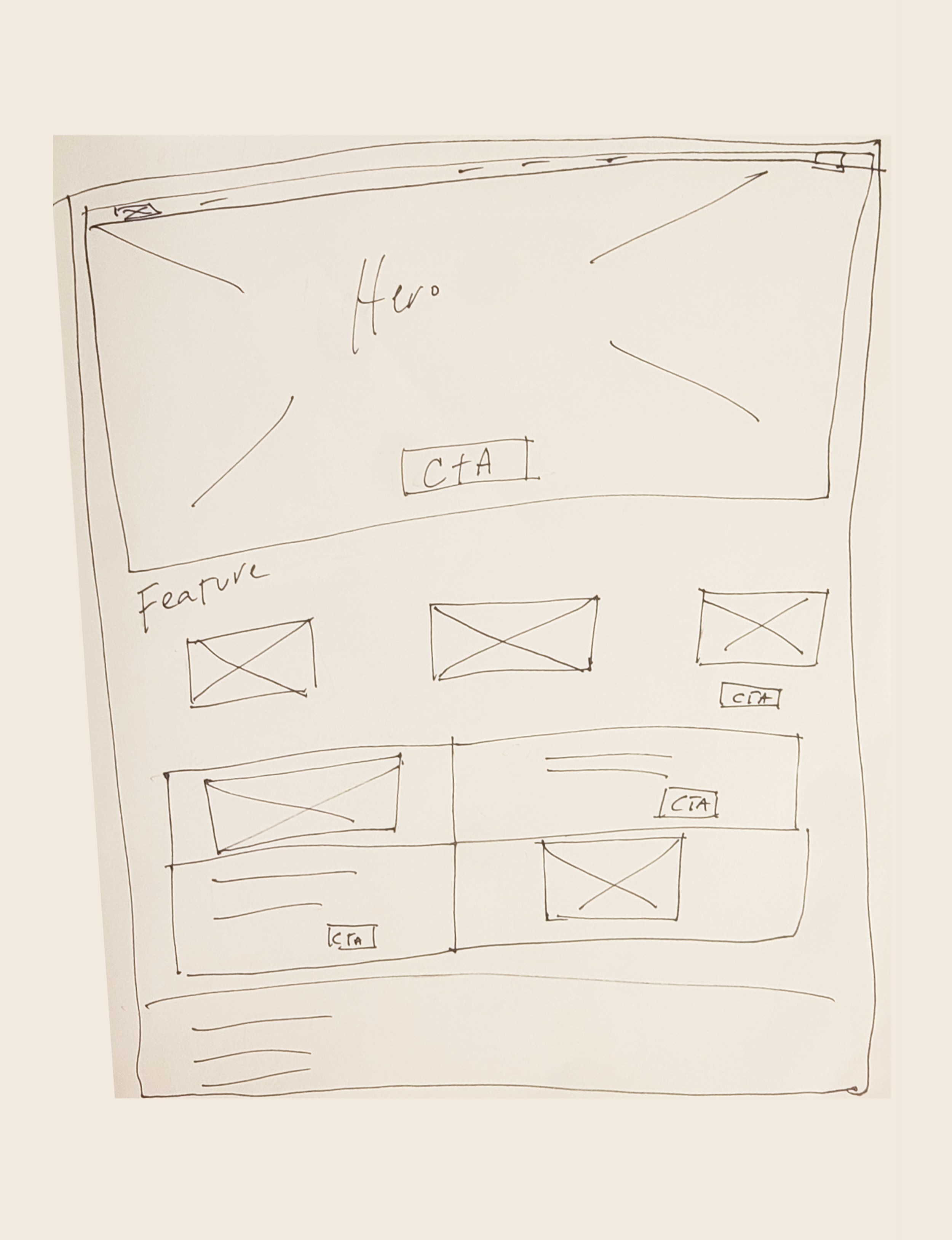 Before creating digital wireframes, I sketched the initial homepage layout by hand to explore structure, hierarchy, and user flow. This early sketch helped establish a clear foundation for the homepage before moving into digital design.